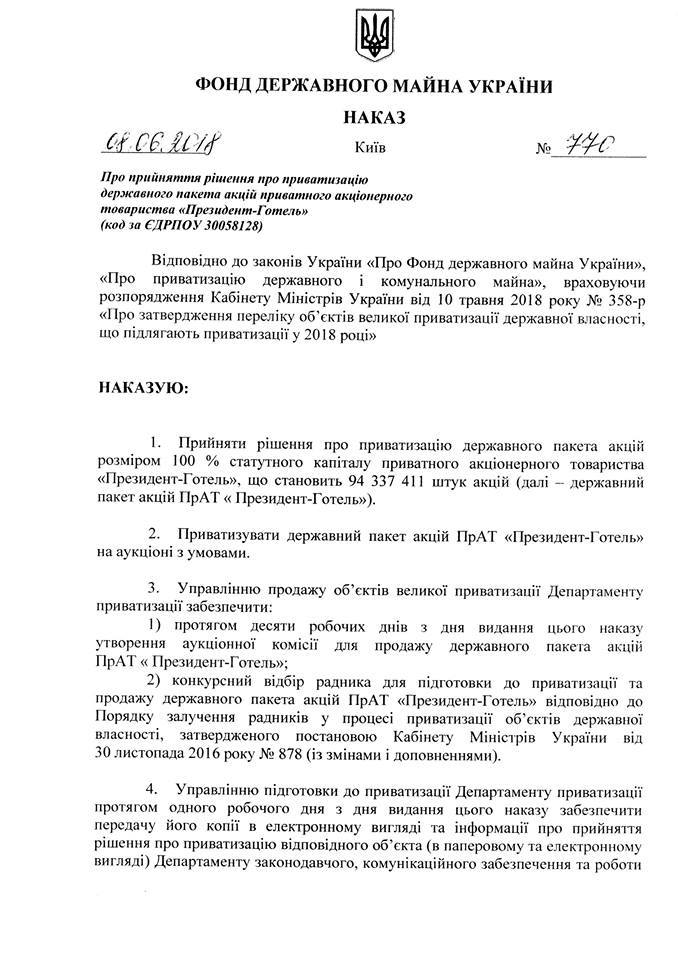 Одним из предприятий, которые продадут в этом году, станет "Президент-Отель". Планируется приватизировать государственный пакет акций в размере 100%.