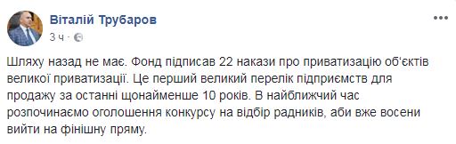 Как сообщал ранее Трубаров, в перечень приватизации на 2018 год вошли ПАО "Центрэнерго", ряд облэнерго и теплоэлектроцентралей, ОАО "Объединенная горно-химическая компания", угольная компания "Краснолиманская", "Азовмаш", "Турбоатом", "Электротяжмаш", "Сумыхимпром", Одесский припортовый завод, Запорожский титано-магниевый комбинат, "Украгролизинг", ОАО "Аграрный фонд" и Государственная продовольственно-зерновая корпорация.