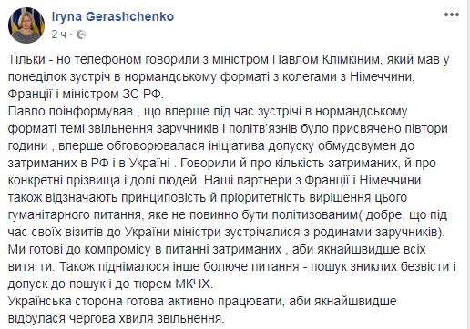 Об этом представитель Украины в Трехсторонней контактной группе по урегулированию ситуации на Донбассе Ирина Геращенко написала в Facebook после телефонного разговора с главой МИД Павлом Климкиним.