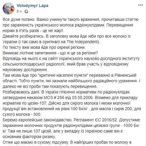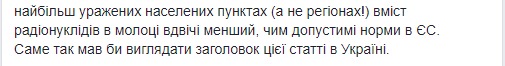 "Итак что имеем в сухом остатке. В худших пробах по молоке в наиболее пораженных населенных пунктах (а не регионах!) содержание радионуклидов в молоке в два раза меньше, чем допустимые нормы в ЕС. Именно так должен выглядеть заголовок этой статьи в Украине", - подытожил он.