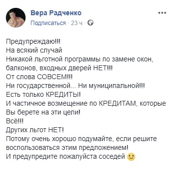 "Предупреждаю! На всякий случай. Никакой льготной программы по замене окон, балконов, входных дверей нет! От слова "совсем". Ни государственной, ни муниципальной! Есть только кредиты! И частичное возмещение по кредитам, которые вы берете на эти цели! Все! Других льгот нет! Потому очень хорошо подумайте, если решите воспользоваться этим предложением! И предупредите, пожалуйста, соседей", – написала Радченко.