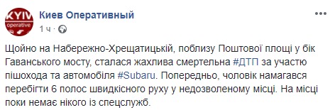 На улице  Набережно-Крещатицкой, возле Почтовой площади в сторону Гаванского моста в Киеве, произошло смертельное ДТП.