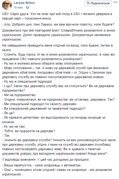 Писательница рассказала о том, как прошел ее повторный визит. Сотрудники СБУ разговаривали с ней на украинском языке, допрос и документация также были на государственном языке.