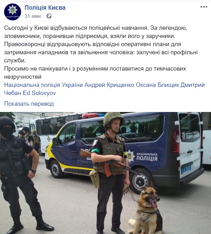 "Сегодня в Киеве проходят полицейские учения. По легенде, злоумышленники, ранив предпринимателя, взяли его в заложники. Правоохранители отрабатывают соответствующие оперативные планы для задержания нападавших и освобождения мужчины: вовлечены все профильные службы. Просим не паниковать и с пониманием отнестись к временным неудобствам", - говорится в сообщении правоохранителей.
