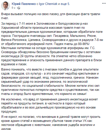 "Нанесен серьезнейший удар по экономике региона, по экологической безопасности, по социальной стабильности, - написал Павленко. - Многие жители этих сел практически полностью потеряли средства к существованию, так как пчелы и огород было единственным, что кормило их семьи! Не исключено, что вред от применения данного инсектицида может перейти на продукты питания", - говорится в сообщении.