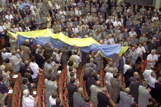 В День принятия Конституции в парламенте впервые прозвучал гимн Украины, в зал внесли государственный флаг.