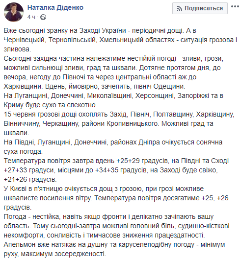 "Уже сегодня утром на западе Украины - периодические дожди. А в Черновицкой, Тернопольской, Хмельницкой областях - ситуация грозовая и ливневая.
