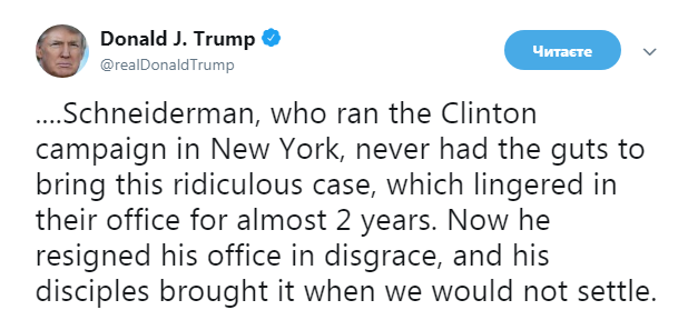 "Теперь, когда я вернулся из Сингапура, где мы достигли отличного результата в отношении Северной Кореи, должен с грустью вернуться к "Охоте на ведьм", всегда помня о том, что не было никакого сговора и никаких помех (расследованию - Прим.Ред.) сфабрикованного Не преступления