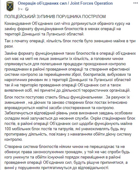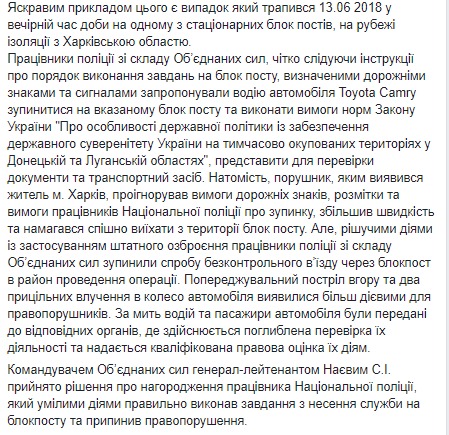 Как сообщает в четверг пресс-центр ООС на странице в соцсети Facebook, накануне вечером, 13 июня, на одном из стационарных блокпостов на границе с Харьковской областью работники полиции из состава ООС, следуя инструкциям, предложили водителю автомобиля Toyota Camry остановиться и, согласно закону, представить для проверки документы и транспортное средство.