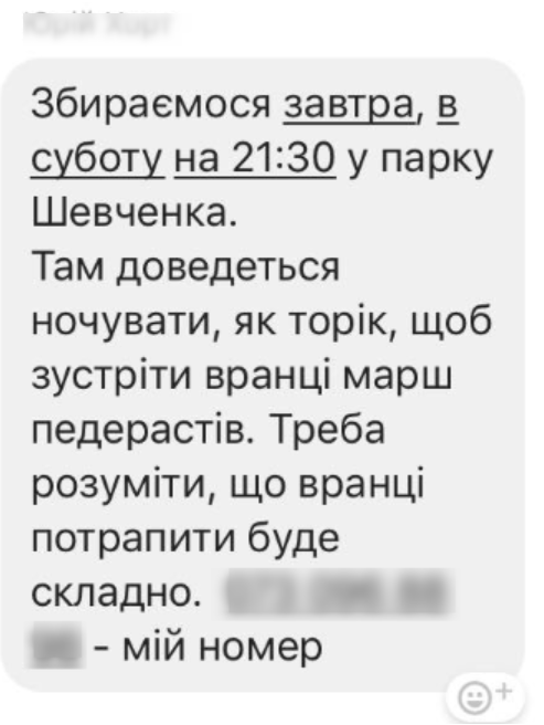 На ресурсах националистических организаций уже появились анонсы акций. В одном из приватных Facebook-чатов националистов призвали ночевать в парке Шевченко, чтобы с утра ждать шествия ЛГБТ.