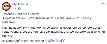 "Судя по всему, мужчина утонул во время вчерашнего вечернего дождя, когда уровень воды в коллекторах поднимается до максимума в течении минуты", - сказано в сообщении.