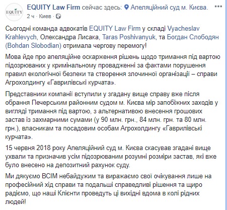 Адвокаты из Equity Law Firm отмечают, что "представители компании вступили в упомянутое выше дело уже после избрания Печерским районным судом Киева мер мер в виде содержания под стражей, с альтернативой внесения денежных залогов с заоблачными суммами (в 90 млн. грн., 84 млн. грн. и 80 млн. грн.), владельцам и должностным лицам агрохолдинга "Гавриловские курчата".