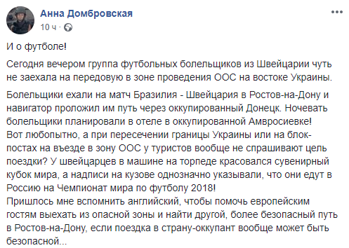 "Болельщики ехали на матч Бразилия - Швейцария в Ростов-на-Дону и навигатор проложил им путь через оккупированный Донецк. Ночевать болельщики планировали в отеле в оккупированной Амвросиевке!" - отметила Домбровская.