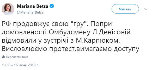 "РФ продолжает свою "игру". Несмотря на договоренности, омбудсмену Л. Денисовой отказали во встрече с М. Карпюком. Выражаем протест, требуем доступа", - написала Беца.