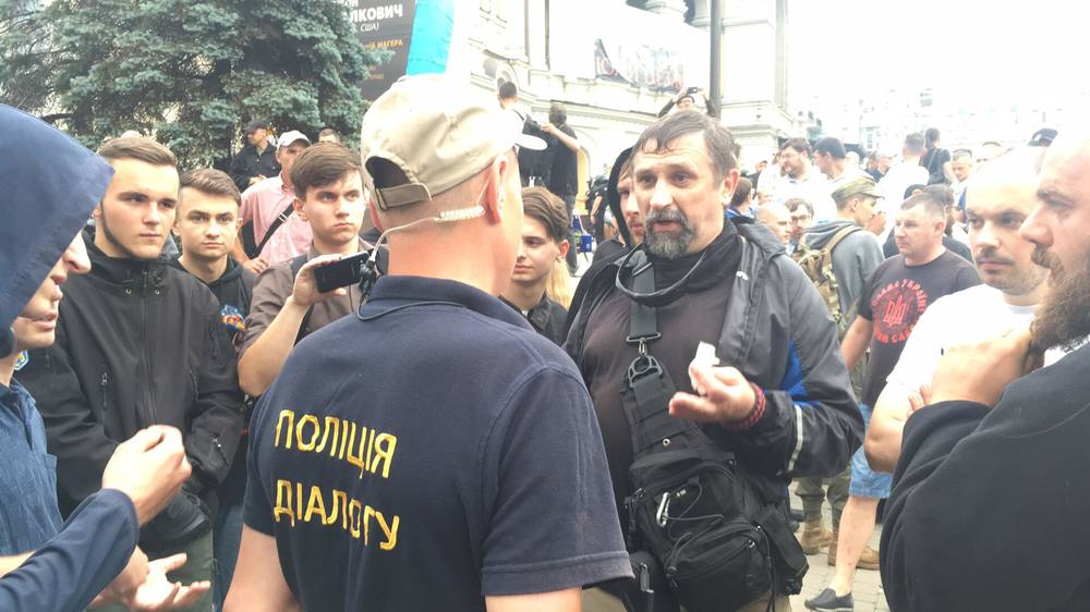 7:34  У Национальной оперы, откуда двинется марш, уже стоят представители разных националистических организаций, выступающих против марша. Их около сотни человек. Видна символика "Сокола", С14, Правого сектора и "Белого молота".