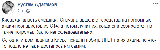 "Киевская власть смешная. Сначала выделяет средства на погромные акции неонацистов из С14, а потом лупит их, когда они собираются на такие погромы. Как-то непоследовательно", - пишет блогер Рустем Агадамов.