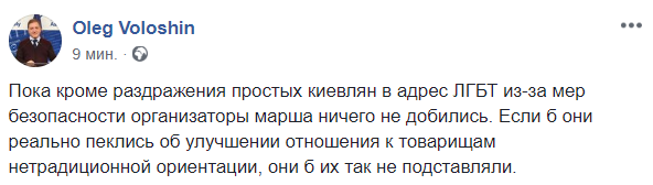 "Пока кроме раздражения простых киевлян в адрес ЛГБТ из-за мер безопасности организаторы марша ничего не добились. Если б они реально пеклись об улучшении отношения к товарищам нетрадиционной ориентации, они б их так не подставляли", - пишет политолог Олег Волошин.