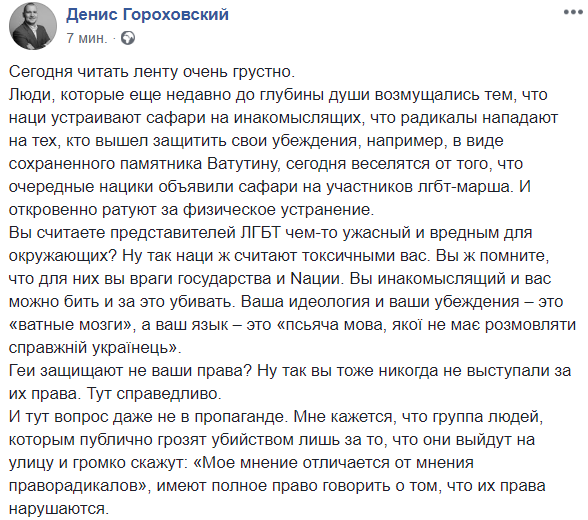 "Люди, которые еще недавно до глубины души возмущались тем, что наци устраивают сафари на инакомыслящих, что радикалы нападают на тех, кто вышел защитить свои убеждения, например, в виде сохраненного памятника Ватутину, сегодня веселятся от того, что очередные нацики объявили сафари на участников лгбт-марша. И откровенно ратуют за физическое устранение.