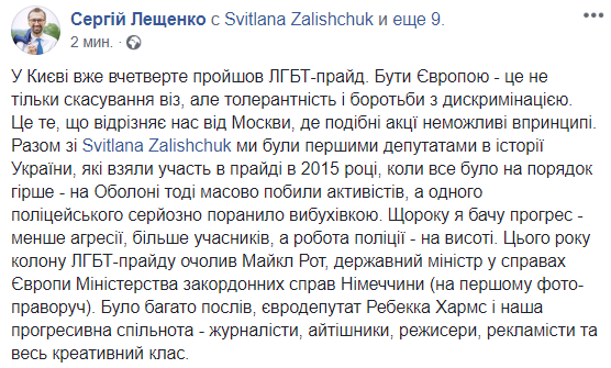 "Каждый год я вижу прогресс - меньше агрессии, больше участников, а работа полиции - на высоте. В этом году колонну ЛГБТ-прайда возглавил Майкл Рот, министр по делам Европы МИД Германии. Было много послов, евродепутат Ребекка Хармс и наша прогрессивная общественность - журналисты, айтишники, режиссеры,