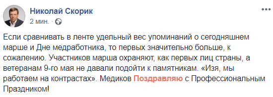12:12  "Если сравнивать в ленте удельный вес упоминаний о сегодняшнем марше и Дне медработника, то первых значительно больше, к сожалению. Участников марша охраняют, как первых лиц страны, а ветеранам 9-го мая не давали подойти к памятникам. "Изя, мы работаем на контрастах", - пишет нардеп Николай Скорик.