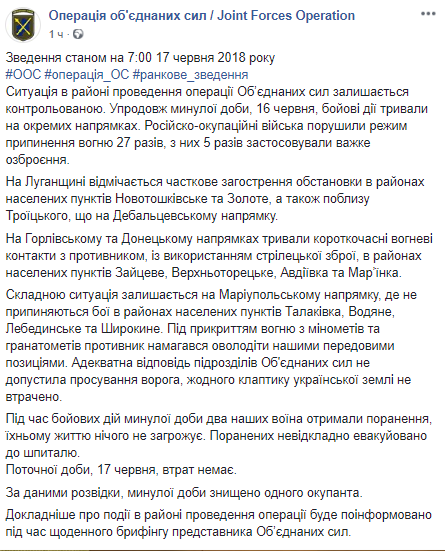 "Во время боевых действий в минувшие сутки два наших воина получили ранения, их жизни ничего не угрожает. Раненых срочно эвакуировали в госпиталь. За 17 июня потерь нет", - добавили в штабе.