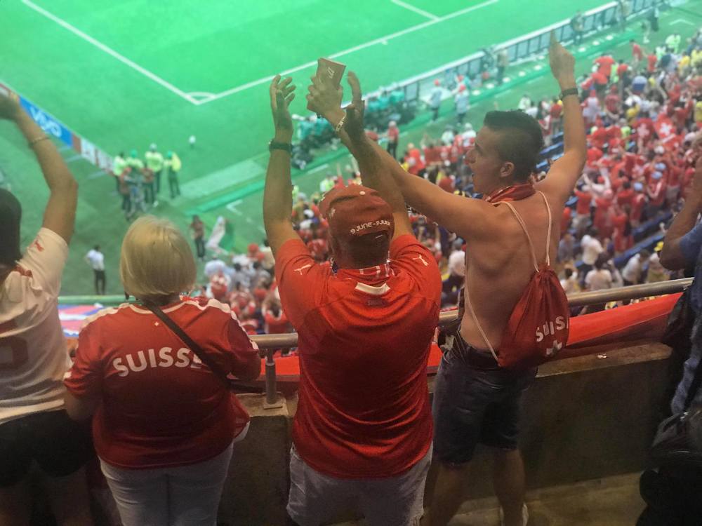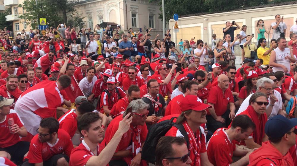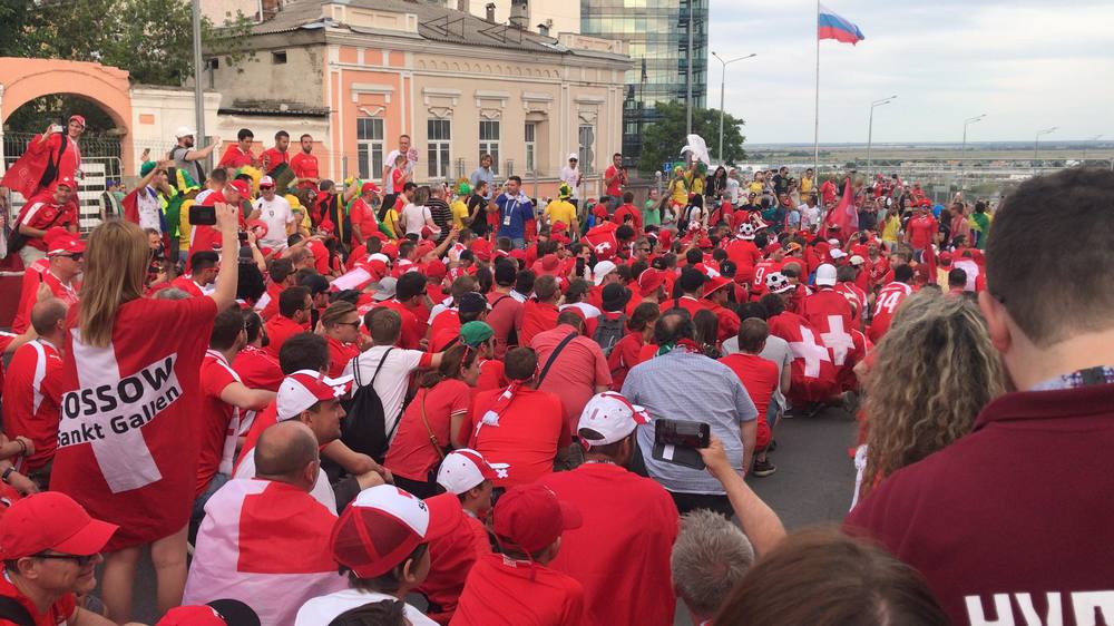 20.25 Полчаса до матча, ведущие развлекают фанатов и учат петь бразильскую песню на караоке, а болельщики сборной Швейцарии, которые движутся к стадиону, разминают глотки.