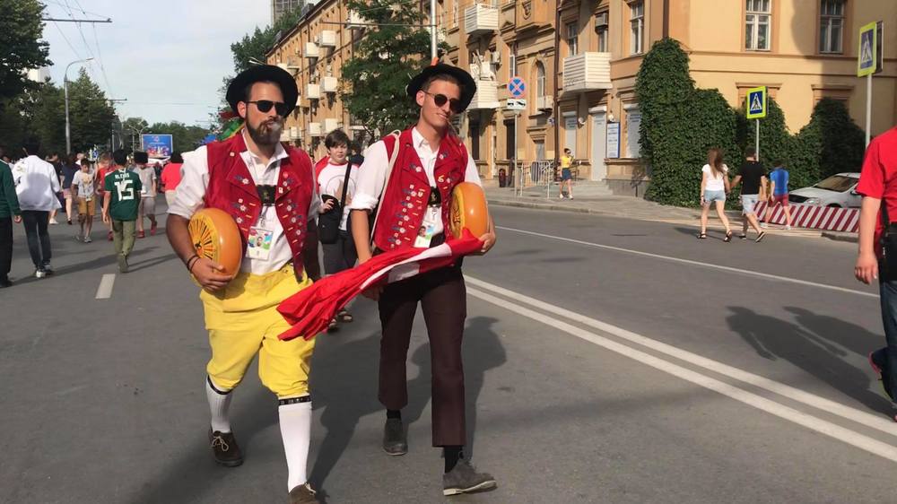 Двое парней из городка с труднопроизносимым названием прибыли в Ростов на матч с Бразилией. Для опознания свой-чужой фаны держат головку швейцарского сыра.