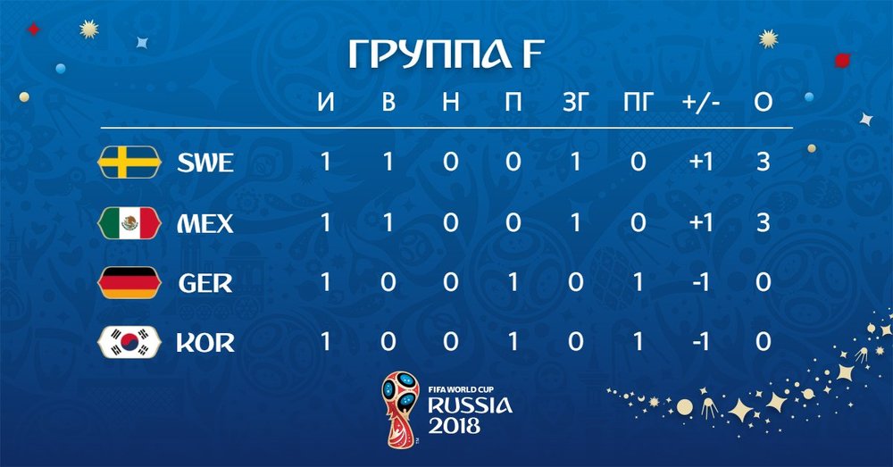 17.08 Положение команд в Группе F, где первые места неожиданно у шведов и мексиканцев, а сборная Германии - в подвале турнирной таблицы.