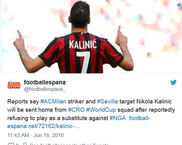 13:00 А в сборной Хорватии громкий скандал. Похоже, форвард Милана Никола Калинич, может досрочно покинуть ЧМ - 2018 из-за своего строптивого характера.