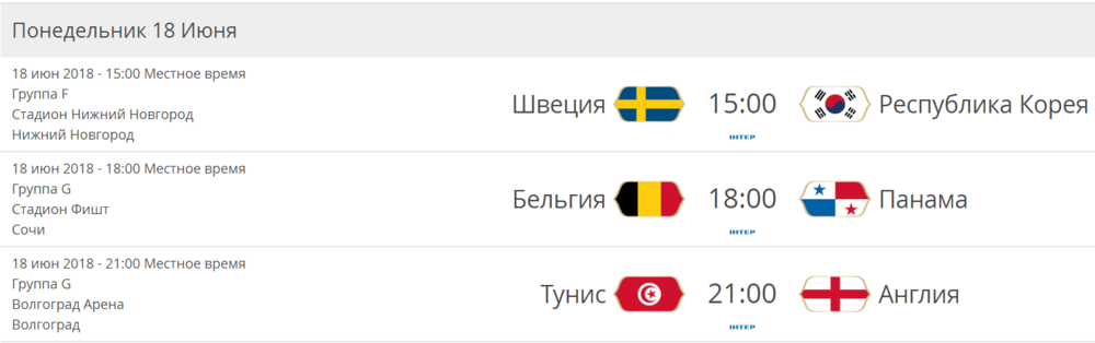 Мы сделали обзор всех событий 17 июня на Мундиале. Сегодня же расписание игр выглядит так: в 15.00 Швеция сыграла с Южной Кореей в Нижнем Новгороде - 1:0, Бельгия сошлась с Панамой в Сочи, где выиграла 3:0. И закрыла этот день встреча Тунис - Англия в Волгограде, где сильнее были англичане, который в самой концовке добились победы - 2:1.