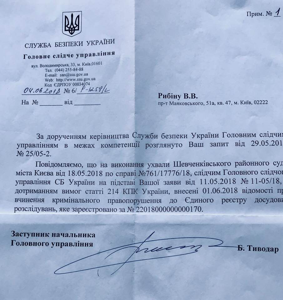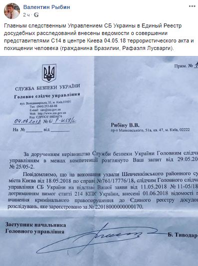 "Главным следственным Управлением СБ Украины в Единый Реестр досудебных расследований внесены ведомости о совершении представителями С14 в центре Киева 04.05.18 террористического акта и похищении человека (гражданина Бразилии, Рафаэля Лусварги)", - написал Рыбин.