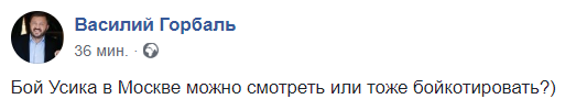"Бой Усика в Москве можно смотреть или тоже бойкотировать?", - спрашивает в Facebook банкир Василий Горбаль.