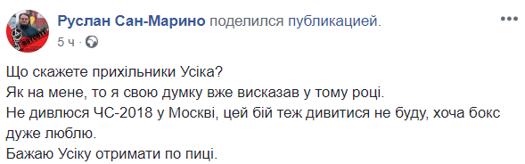 "Не смотрю ЧМ-2018 в Москве, этот бой тоже смотреть не буду, хотя бокс очень люблю. Желаю Усику получить по морде", - пишет волонтер и активист Руслан Сан-Марино.