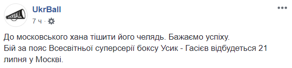 А в сообществе спортивных фанатов Ukrball написали, что Усик едет "к московскому хану радовать его челядь". Но пожелали успеха.
