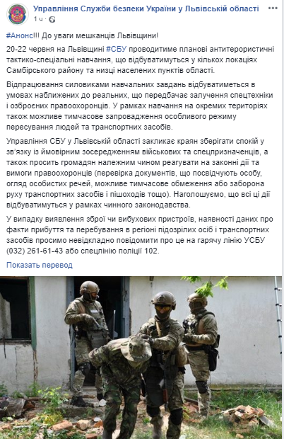 Во Львовской области Служба безопасности Украины намерена провести плановые антитеррористические тактико-специальные учения 20-22 июня. Об этом сообщает пресс-центр СБУ в Facebook.