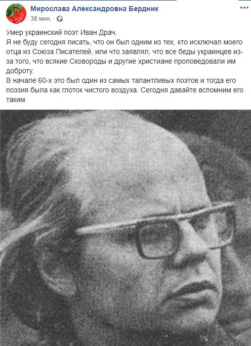 Публицист Мирослава Бердник вспоминает о творчестве Драча: "Умер украинский поэт Иван Драч. Я не буду сегодня писать, что он был одним из тех, кто исключал моего отца из Союза Писателей, или что заявлял, что все беды украинцев из-за того, что всякие Сковороды и другие христиане проповедовали им доброту.
