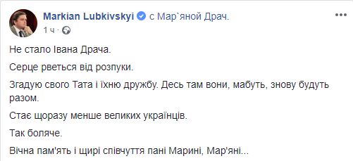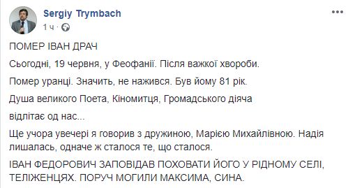 Сергей Трымбач первым сообщил новость о смерти политика и поэта: "Умер Иван Драч. Сегодня, 19 июня, в Феофании. После тяжелой болезни. Умер утром. Значит, не нажился. Был ему 81 год.