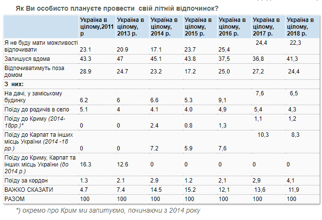 Большие разногласия относительно планов на отдых среди жителей сел и городов. Так, 79% жителей сел не планируют никуда ехать, лишь 3% планируют поездку на дачу.