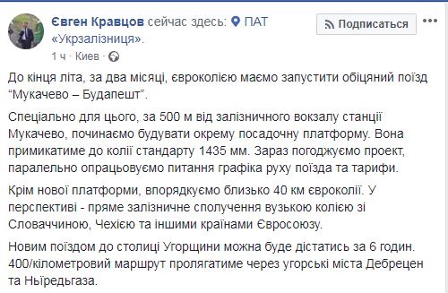 "До конца лета, за два месяца, евроколеей должен быть запущен обещанный поезд Мукачево – Будапешт", - написал он.