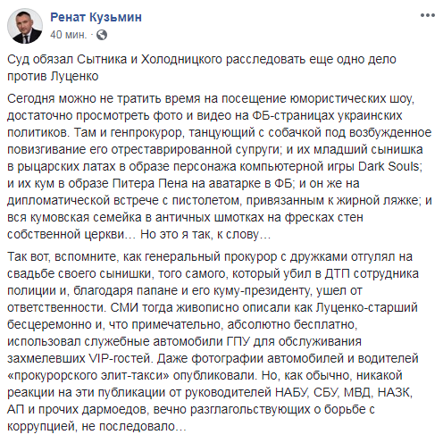 Ведомствам поручено разобраться в "развозе" гостей Луценко на двух служебных автомобилях прокуратуры. Об этом в Facebook сообщил Ренат Кузьмин.