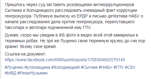 Думаю, скоро мы увидим в ФБ фото и видео всей этой камарильи в тюремных робах. Не зря же Луценко свою тюремную кружку до сих пор хранит. Всему свое время", - написал бывший заместитель генерального прокурора Украины.