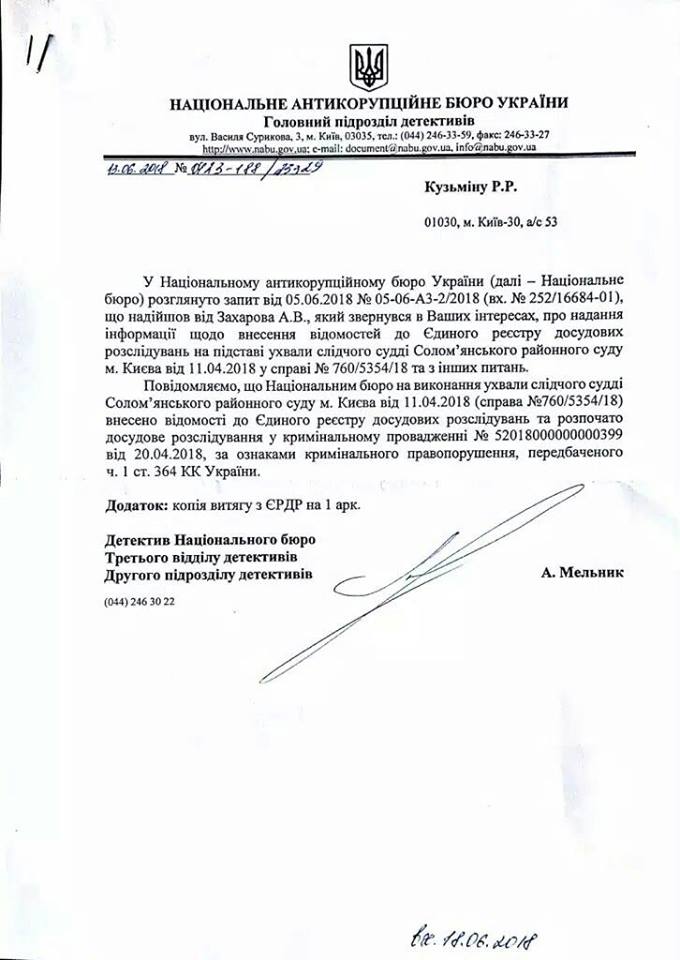 Пришлось через суд заставить розовощеких антикоррупционеров Сытника и Холодницкого расследовать очевидный факт коррупции генпрокурора. Публикую выписку из ЕРДР и письмо детектива НАБУ о начале расследования дела против генпрокурора, перепутавшего таксопарк и автопарк подчиненной ему ГПУ.