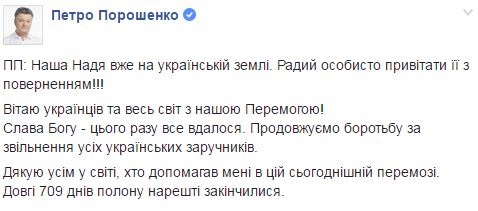 17:00 Президент Петр Порошенко, который сегодня отмечает два года своей каденции, поблагодарил украинцев за помощь в освобождении Надежды Савченко и намекнул, что освобождение Савченко - его заслуга. Об этом глава написал на своей странице в Facebook.
