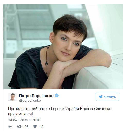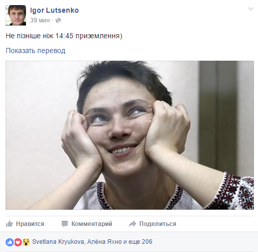 13:35 Игорь Луценко пишет, что Савченко прилетит в Украину уже в течении часа.