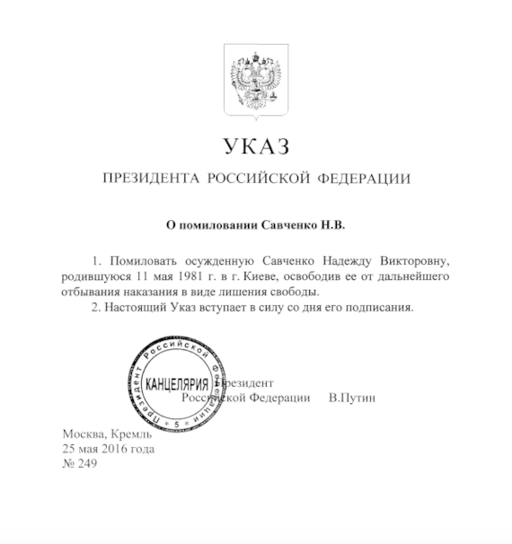 16:09 Указ о помиловании Савченко появился на сайте Кремля.