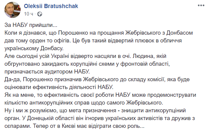 Журналист Алексей Братущак считает, что Жебривский выстраивал коррупционные схемы на Донбассе - поэтому его назначение в НАБУ носит двусмысленный характер.