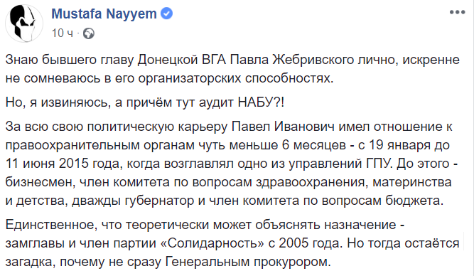 "Действия Порошенко по назначению Жебривского живо напоминают мне позднего Ющенко. Когда впереди выборы, а рейтинг низок. Когда ситуацию нужно срочно исправлять, но доверенных лиц мало, а ключевых должностей много. Да и доверенные лица не так уж хороши, как хотелось бы...".
