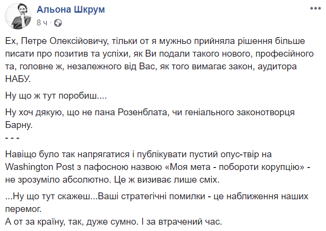 "Эх, Петр Алексеевич, только вот я мужественно приняла решение больше писать о позитиве и успехах, как Вы подали такого нового, профессионального и, главное же, независимого от Вас, как того требует закон, аудитора НАБУ.