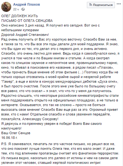 Письмо с некоторыми купюрами Плахов разместил на своей странице в Facebook.