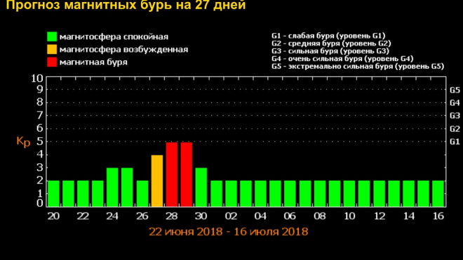 По данным специалистов, самые крупные магнитные бури 2018 года были зарегистрированы прошедшей весной, 18-19 марта, 20 апреля и 5-6 мая 2018 года, когда индекс геомагнитной активности достигал значения 6, что соответствует буре уровня 2 по максимально возможной пятибалльной шкале. Все остальные события этого года, включая и магнитную бурю 18 июня, относятся к минимальному уровню 1.